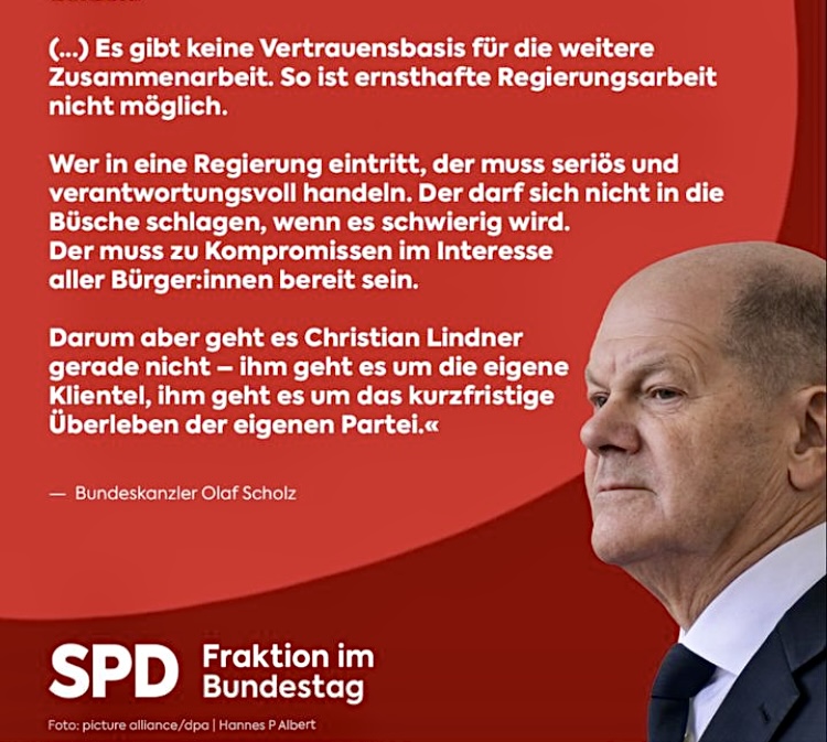 Sicher: Das gemeinsame Regieren war schon lange eine Qual. Nicht, weil wir nicht auch viel Gutes bewirken konnten: Die Sicherung der Energieversorgung, die Rückführung der Inflation, die Reduzierung des Niedriglohnsektors, Erhöhung des Kindergelds und vieles mehr. Sondern weil all das immer wieder konterkariert wurde durch öffentliches Auseinanderlaufen, oftmals direkt nachdem man sich gerade zuvor geeinigt hatte. Jetzt stehen absehbar vorgezogene Neuwahlen an.