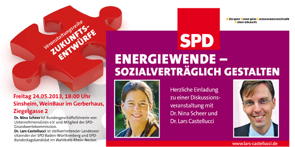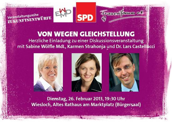 Dienstag, 26.02.2013 um 19.3o Uhr in Wiesloch, Altes Rathaus am Marktplatz, Bürgersaal Veranstaltungsreihe Zukunftentwürfe „Von wegen Gleichstellung“. Herzliche Einladung zu einer Diskussionsveranstaltung mit Sabine Wölfle, MdL, Karmen Strahonja und Dr. Lars Castellucci.