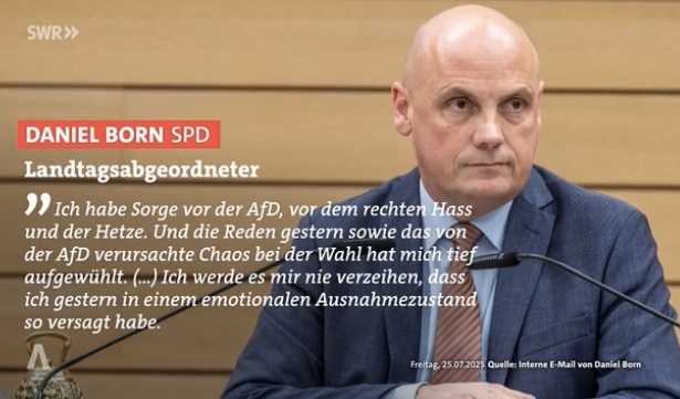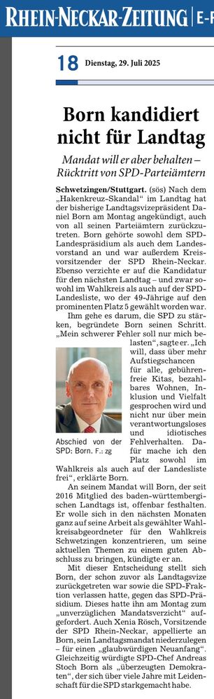 Rechtsextreme Populisten sind ein Schandfleck für diese Republik. Daniel Born ist sich mit der SPD einig: Der Kampf gegen Rechts muss geführt werden. Aber er muss mit den richtigen Mitteln geführt werden. Hinter einem Kandidaten einer gesichert rechtsextremen Partei ein Hakenkreuz zu kritzeln, ist eines Landtagsvizepräsidenten unwürdig - das steht außer Frage. Gerade in dieser besonderen Funktion musste Born auch in hitzigen Debatten darauf achten, dass die Würde des Parlaments gewahrt wird. Dass nun ausgerecht er diese mit Füßen trat ist nicht zu entschuldigen.Andere hätten es vielleicht verschwiegen oder ausgesessen. Er aber konnte seinen schwerwiegenden Fehler nicht mit seinem Gewissen vereinbaren. Das ist hochrespektabel, genau wie sein öffentliches Bekenntnis, für das er nun die Konsequenzen trägt – bis zum Äußersten: Daniel Born hat sich freiwillig geoutet, ist zurückgetreten, hat Ämter niedergelegt und seine Kandidatur zum Landtag aufgegeben. Er ist beschämt und sagt von sich, dass er sich diesen Fehler niemals verzeihen kann. Gewiss, das macht das Vorgefallene . . .