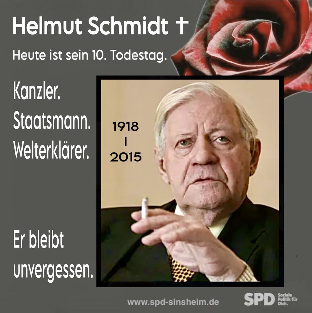 Kurz vor seinem 97. Geburtstag sei er „friedlich eingeschlafen“, hieß es damals. Am 10. November jährt sich der Todestag des früheren sozialdemokratischen Bundeskanzlers (1974-1982) zum zehnten Male.