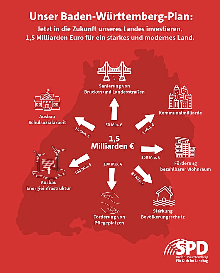 Der Bund hat es vorgemacht, jetzt muss das Land nachziehen. Wir wollen jährlich 1,5 Milliarden Euro in ein starkes und modernes Baden-Württemberg investieren: