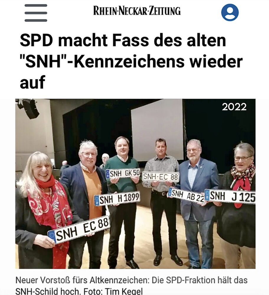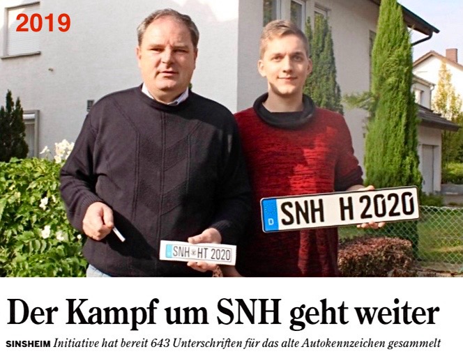 Geduld war gefragt: Seit 2012 (!) hat man sich in Sinsheim und Umgebung um die Reaktivierung des Altkennzeichens bemüht. Gerade die SPD-Fraktion hat dies im Gemeinderat immer wieder zur Sprache gebracht und damit dem bürgerschaftlichen Engagement Gehör verschafft. Sie spürte früh, dass es in der Bevölkerung den großen Wunsch nach mehr lokaler Verortung über die Ortskennung auf den Nummernschildern gab.