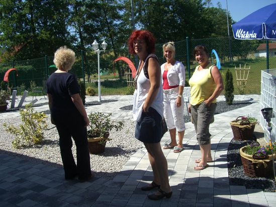 Nach kurzer Fahrt bot sich dem Auge bei schönstem sommerlichem Wetter ein sehr angenehmer Anblick. Genügend Parkplätze vor der Einrichtung wurde schon mal positiv aufgenommen, damit gerade ältere Menschen einen kurzen Weg zum Eingang haben. Über die überdachte Terrasse, die über genügend Tische und Sitzplätze verfügt, gelang man an den Haupteingang. Im Außenbereich gibt es verschiedene Sitzmöglichkeiten mit Sonnenschirmen und eine für Senioren ausgelegte Außenanlage. Hier können gerade Gäste, die immer eine gewisse Unruhe haben, ebenerdig ihre Runden drehen, ohne das Grundstück zu verlassen. Den Besuchern bot sich auch hier ein sehr angenehmes anheimelndes Bild.